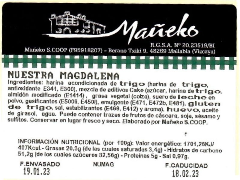 | Cantidad (Magdalenas) | 1 Kg. (approx. 10-12 pieces), 1/2 Kg. (approx. 6-8 pieces), 2 Kg. (approx. 20-24 pieces) |