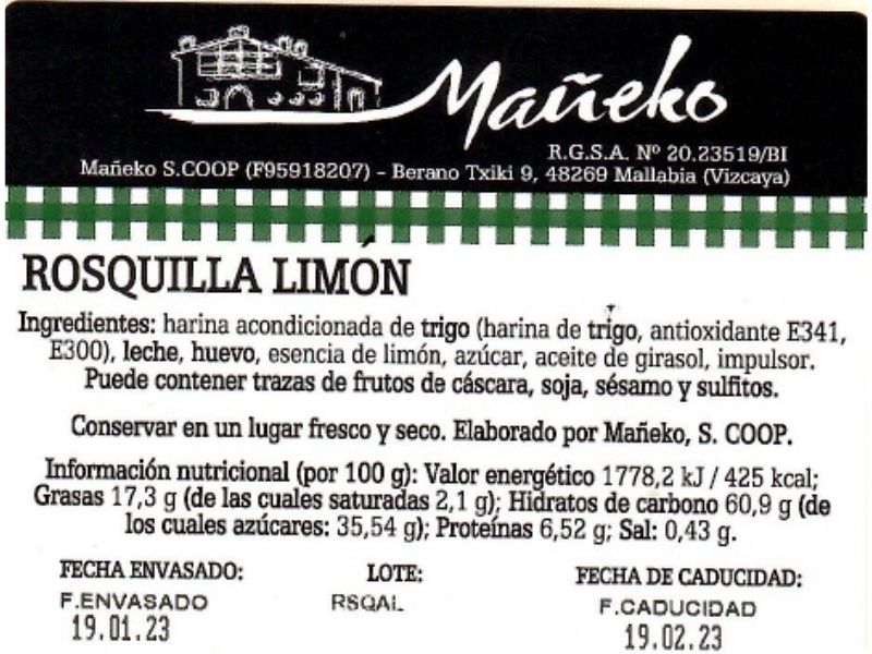 Harina de trigo, Leche, Huevo, Esencia de limón, Azúcar, Aceite de girasol e Impulsor. Puede contener trazas de frutos de cáscara, soja, sésamo y sulfitos.